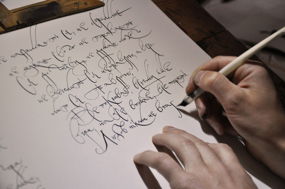 Imagine ten calligraphers gathered together to represent their cultures through the art of calligraphy. Each calligrapher uses her or his own language and its specific script to transform words into art. Every one of their carefully chosen words then gives voice to an important cultural text, a prayer, a story, or simply a creative train of thought. The languages represented on this particular night included Estonian, Russian, Japanese, Chinese, Arabic, Georgian, Armenian, Portuguese, Czech, and Ukrainian. All the calligraphers sat united around one single table, dressed in white, silently speaking their own culture’s unique stories through the motions of their scripts.