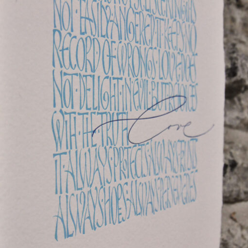 The written text is a citation from the Bible: Love is patient, love is kind. It does not envy, it does not boast, it is not proud. It does not dishonor others, it is not self-seeking, it is not easily angered, it keeps no record of wrongs. Love does not delight in evil but rejoices with the truth. It always protects, always trusts, always hopes, always perseveres. (1 Corinthians 13:4-7)