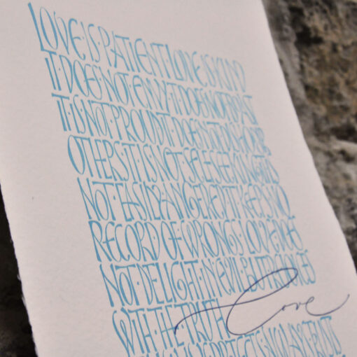 The calligraphy is letterpress printed on our handmade paper made from a mixture of cotton and abaca.
